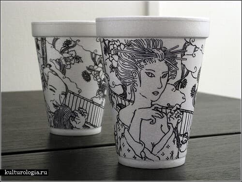 - А вот Чеминг Бои придерживается в своих работах минимализма и использует для искусства только виниловые стаканчики и черный маркер. Выходит не менее здорово!
