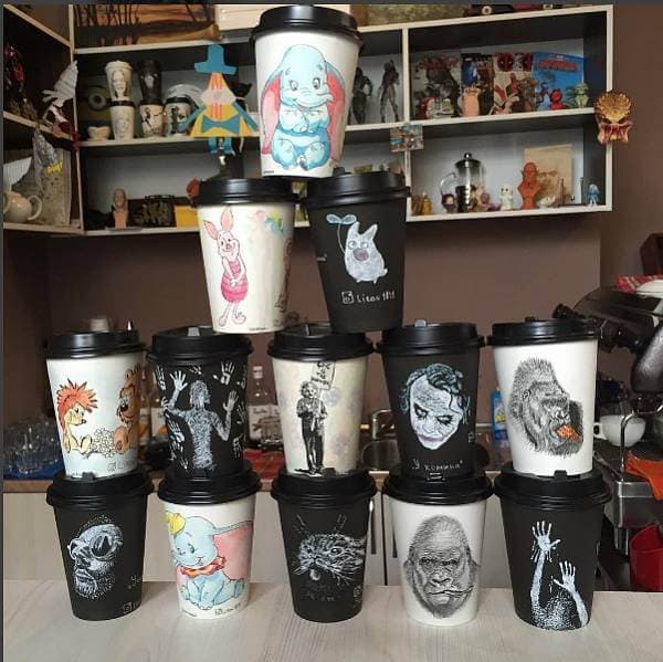 - А это – стаканчики из обычного кафе в Благовещенске, бариста в котором – настоящий мастер росписи.