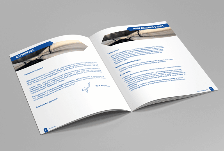 Строительство магистральных газо-нефтепроводов КЛИЕНТ Белстройнефтегаз Дизайн буклета строгий и лаконичный. Задача буклета передать максимум полезной информации, обеспечить положительный образ компании. Заказать консультацию Поделиться: