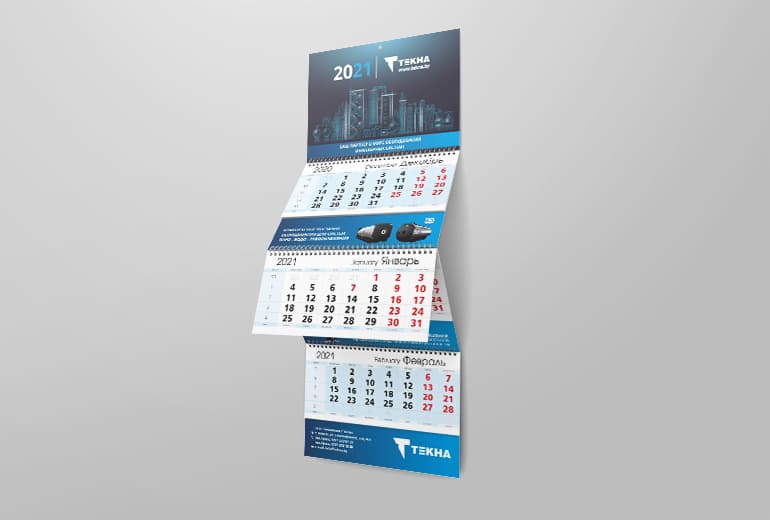 Результат – стильный календарь с тремя рекламными полями. Акцент на поствляемой продукции и контакной информации. Активно использованы фирменные цвета.